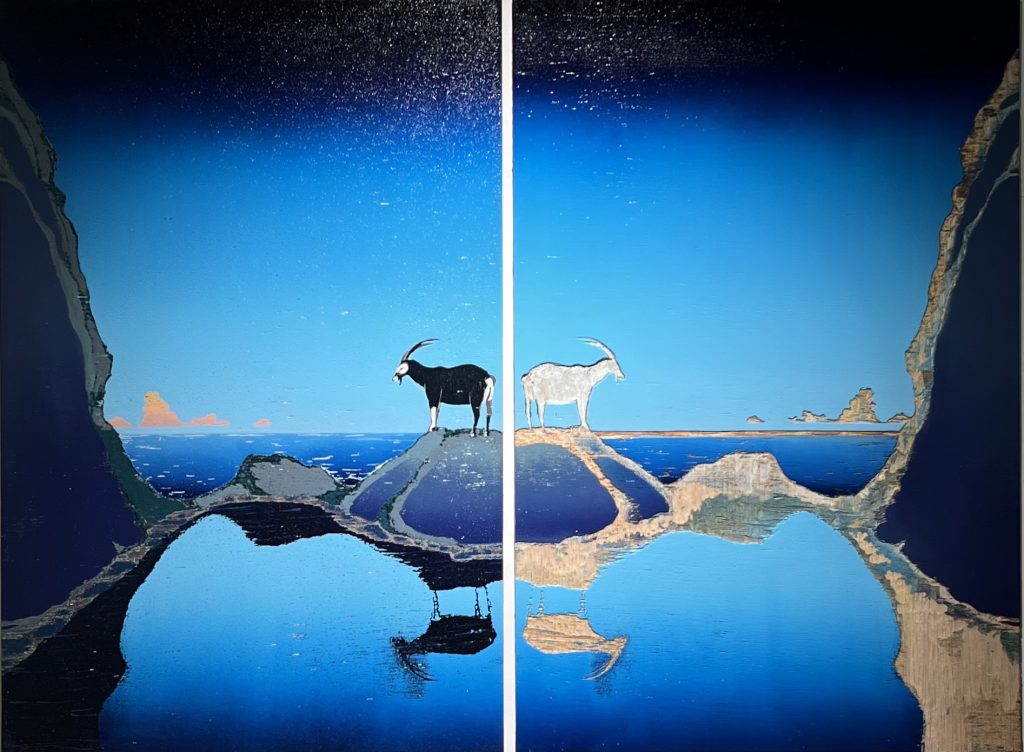 《呼吸・風景》以東部景色作為系列創作,使用三夾板木刻版畫採取單版油墨印刷,紙上原作與刻印原版並列展出,有別於一般對於版畫「複數性」的既定印象,並排的「鏡像」以虛實相映的手法呈現,一半是層層刻除的木板,另一半層層堆疊的紙,「削去」與「堆疊」出虛實對稱的花東自然風光。